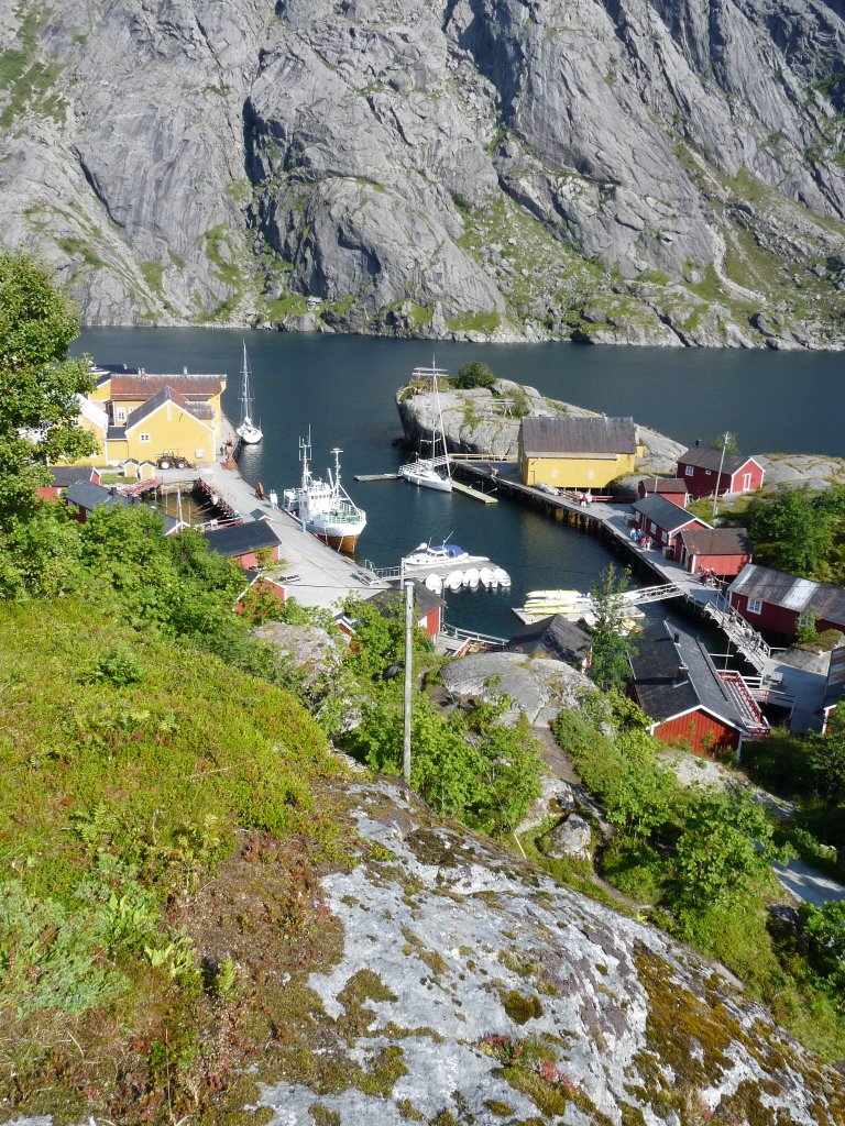 Niché comme un écrin au creux d'un fjord et de 2 rochers, nous arrivons à Nusfjord situé à 10 mn dans le nord de Reine, sous un soleil absolument radieux.